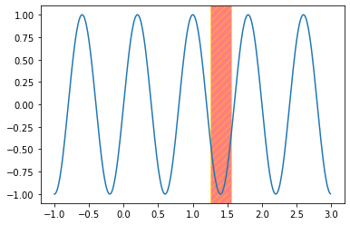 plt.axvspan(1.25, 1.55, facecolor='red', edgecolor='gold', alpha=0.5, hatch='///')